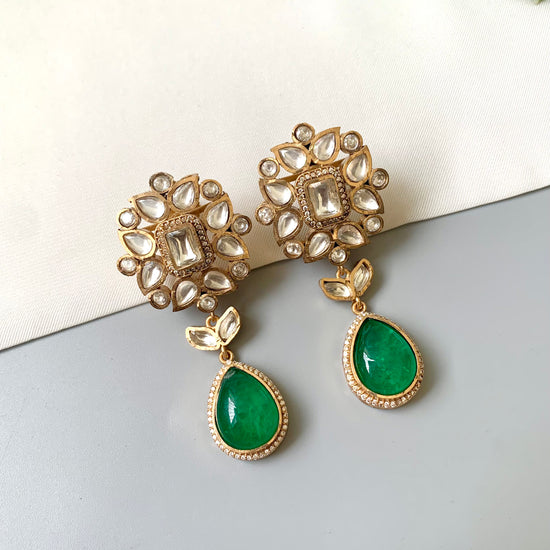 A heritage-inspired design with a modern twist — the Aurelia Emerald Earrings are hand-crafted in a rich 22kt Victorian Gold matte finish. The intricate Polki Kundan floral cluster is set with high-quality American Diamonds, leading into a striking teardrop of semi-precious Emerald doublet stone. Perfect for weddings, festive occasions, or making a timeless statement, these signature earrings embody elegance and tradition.