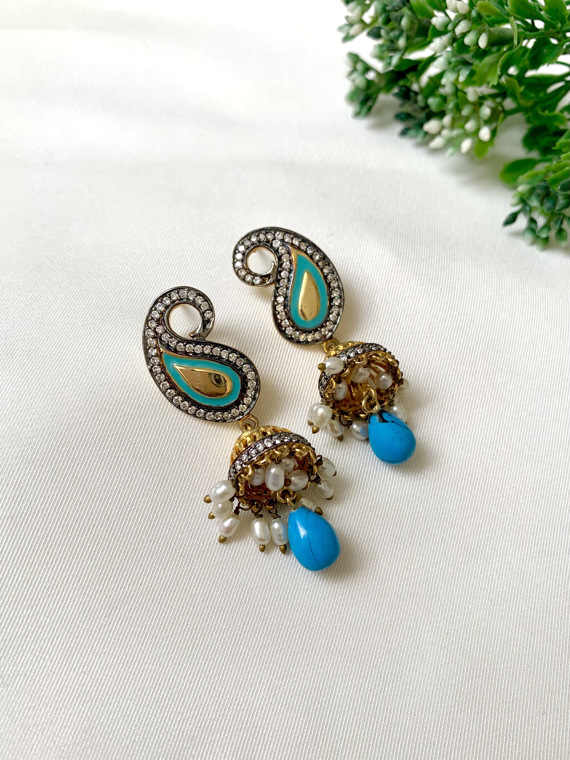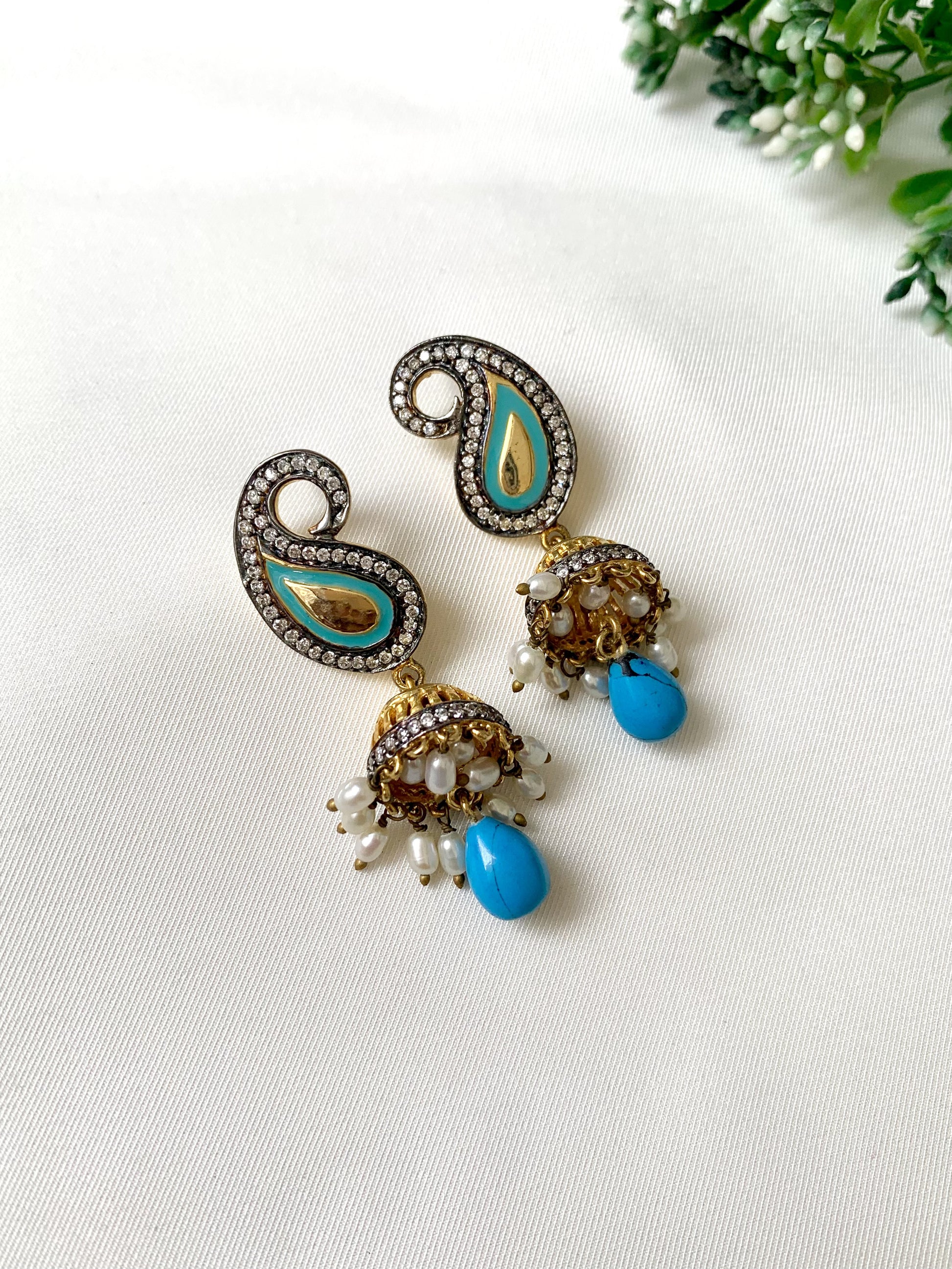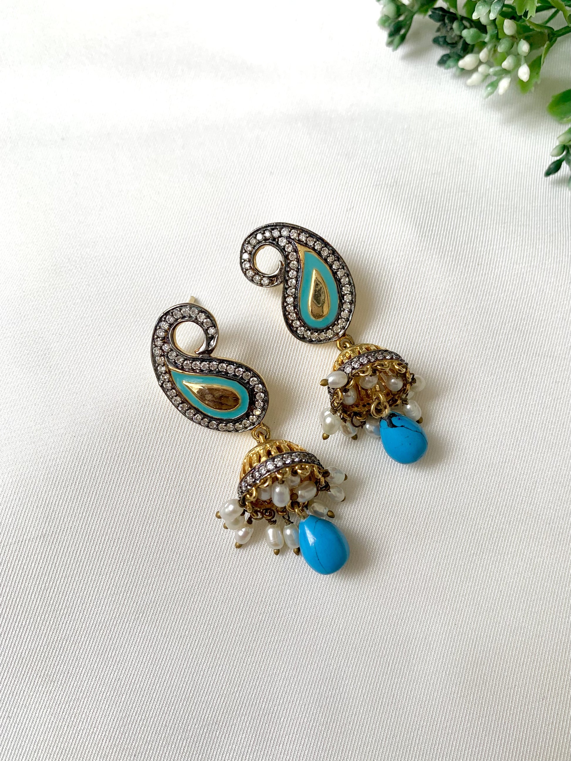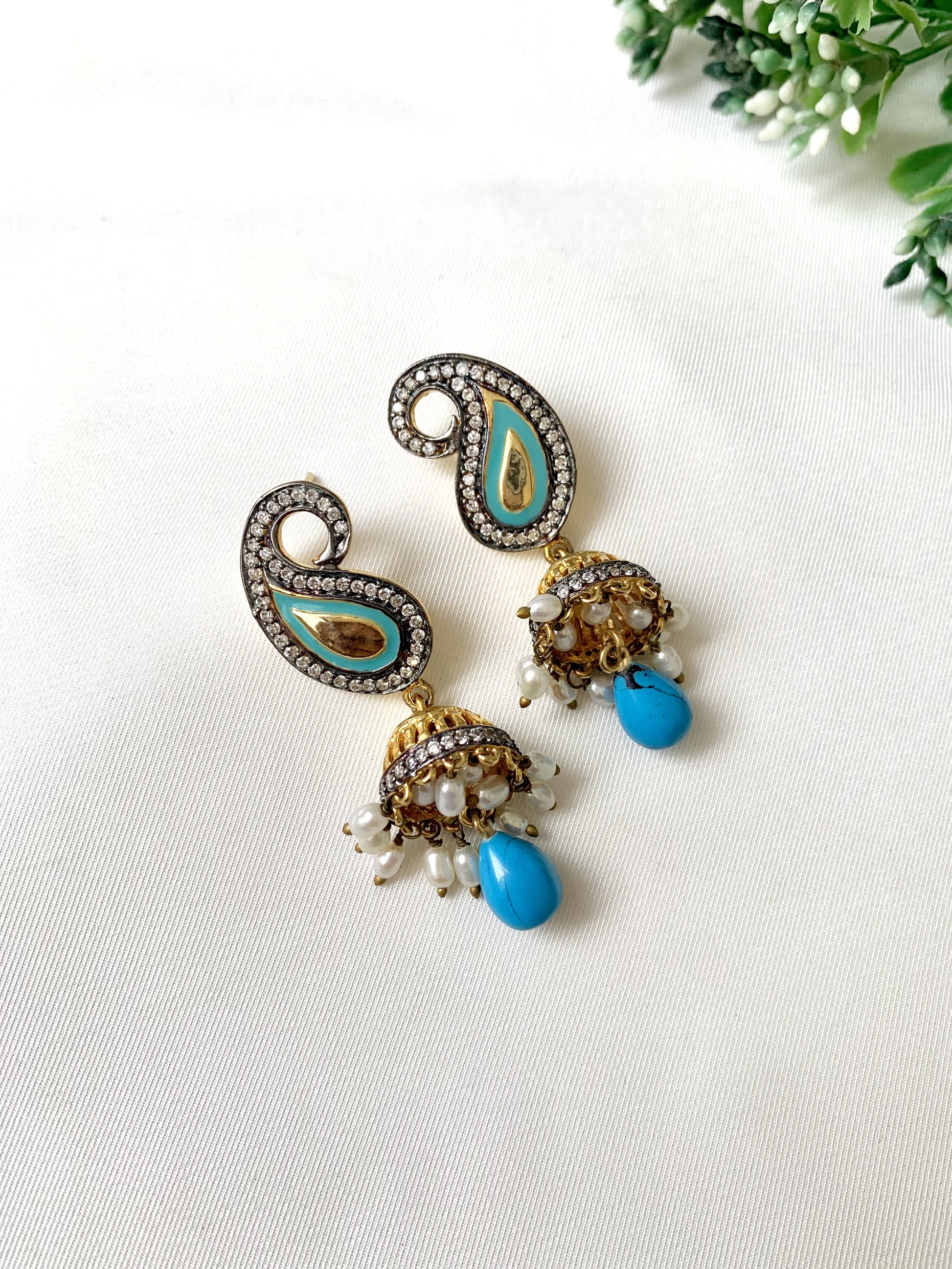 A tribute to timeless charm, the Noora Jhumki is where old-school grace meets modern finesse. Handcrafted in 22kt gold-plated oxidized finish, these statement earrings showcase high quality American Diamonds encircling a teardrop Meena design in turquoise blue. The delicate dome below is crowned with dainty pearl hangings and a bold Feroza drop—each element whispering stories of artisanal legacy.